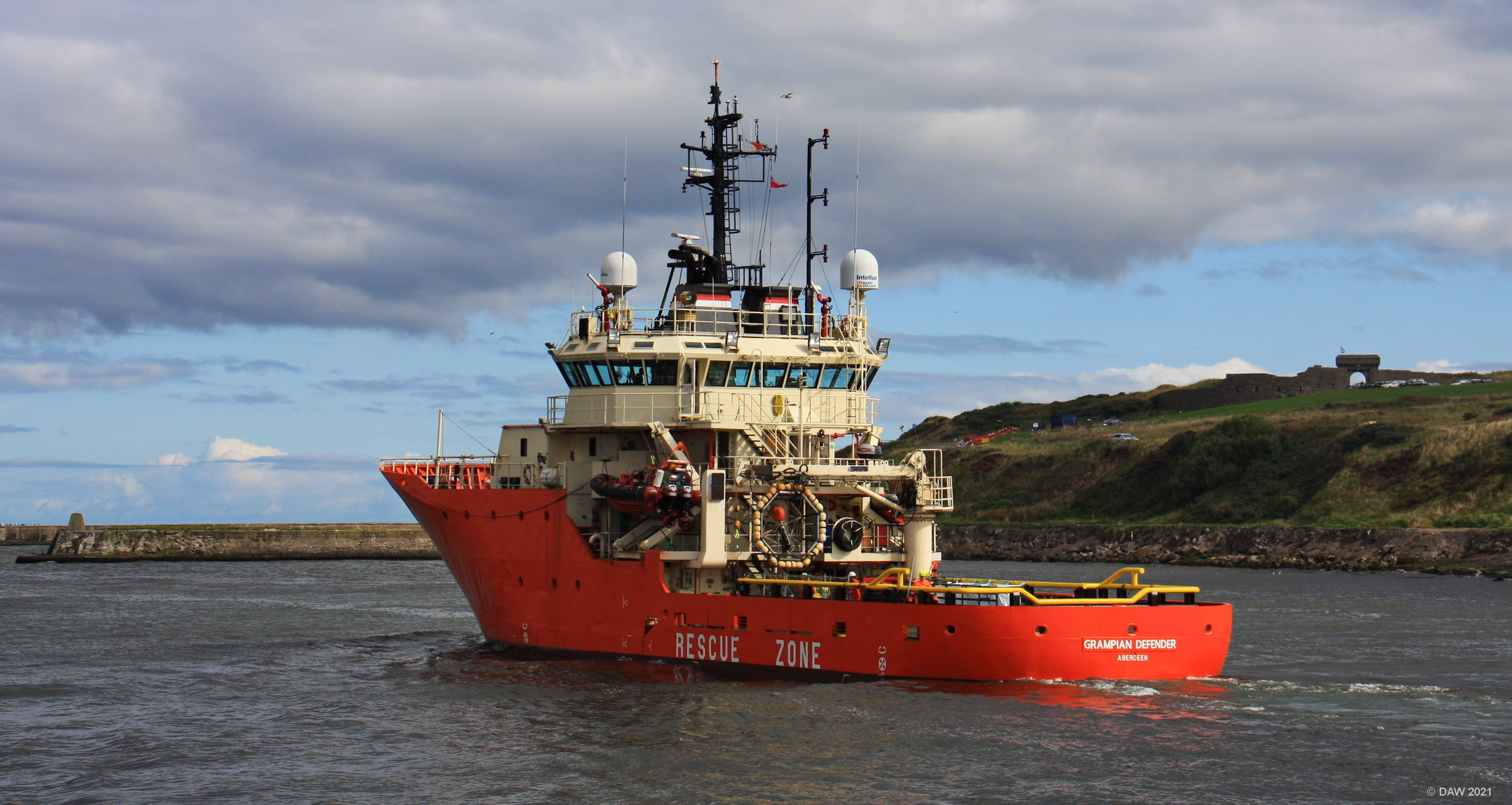 The standby safety vessel Grampian Defender heads out to sea from Aberdeen Harbour. In the background on the hill you can see the arched entrance to the Torry Battery which was an artillery battery dating from 1860.