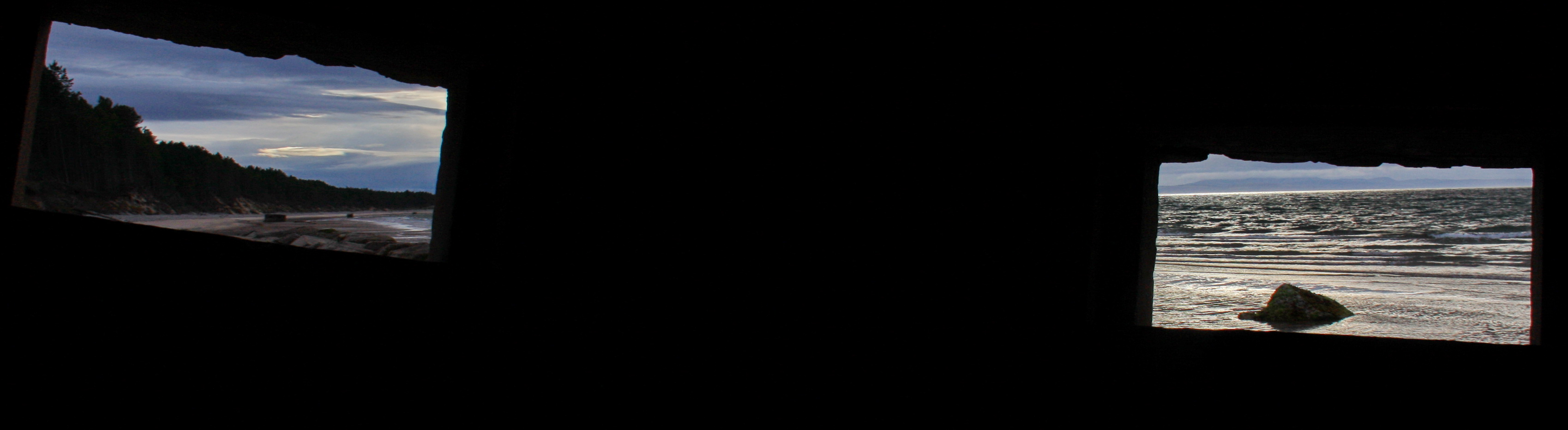 Looking through the openings of one of the second world war bunkers along the beach at Burghead Bay.