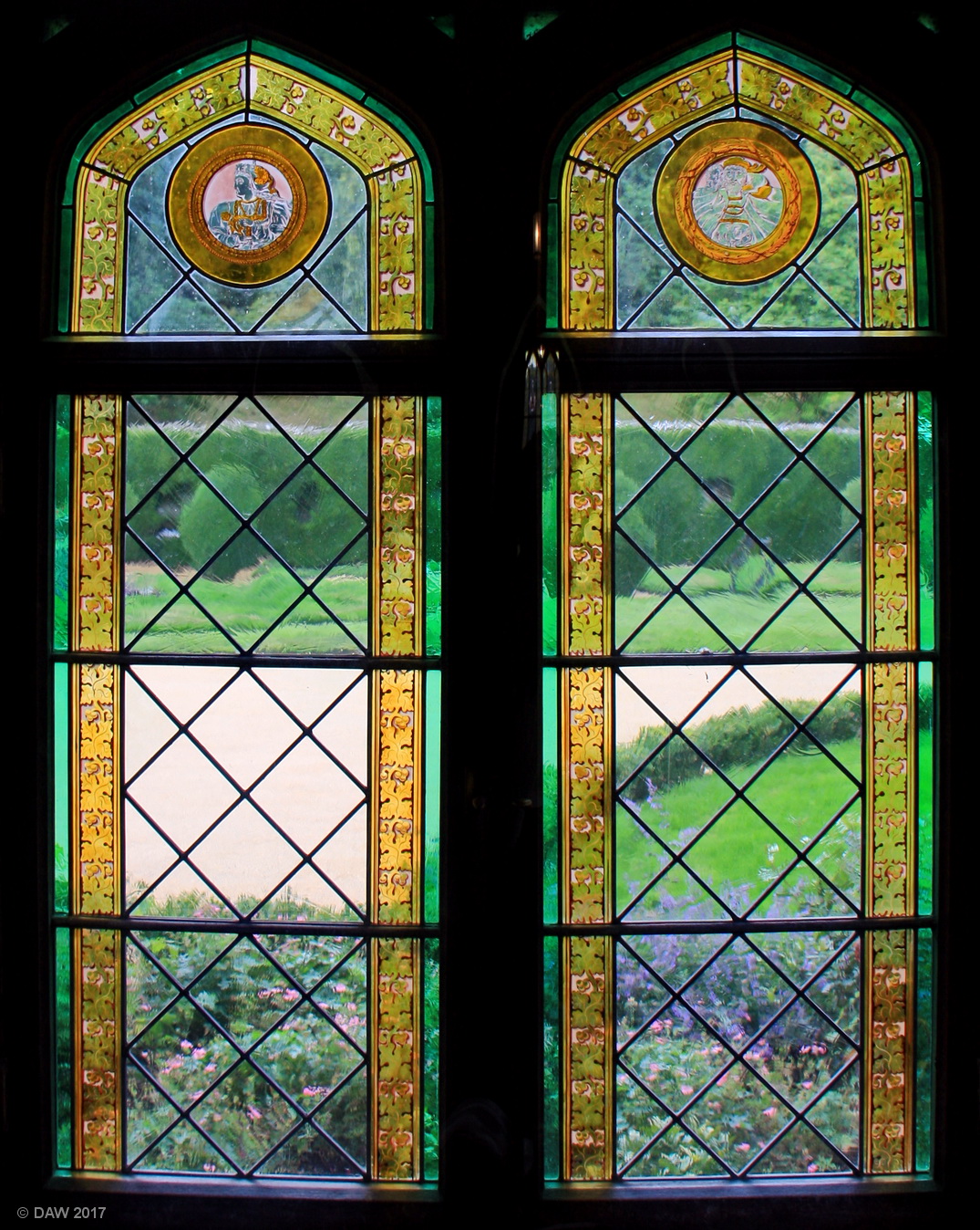Looking out through one of the stained glass windows at