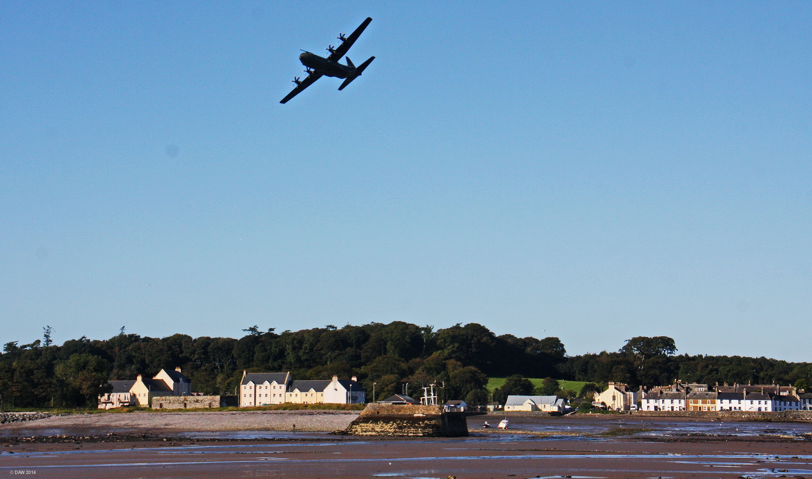 An RAF Hercules transport aircraft banks steeply over Garlieston. The nearest Airfield is West Freugh, but the RAF gave this up in 2001, it is now operated by the defence contractor QinetiQ. The RAF still sometimes makes use of West Freugh for Air Assault exercises during the bi-annual Joint Warrior exercise. Map location.