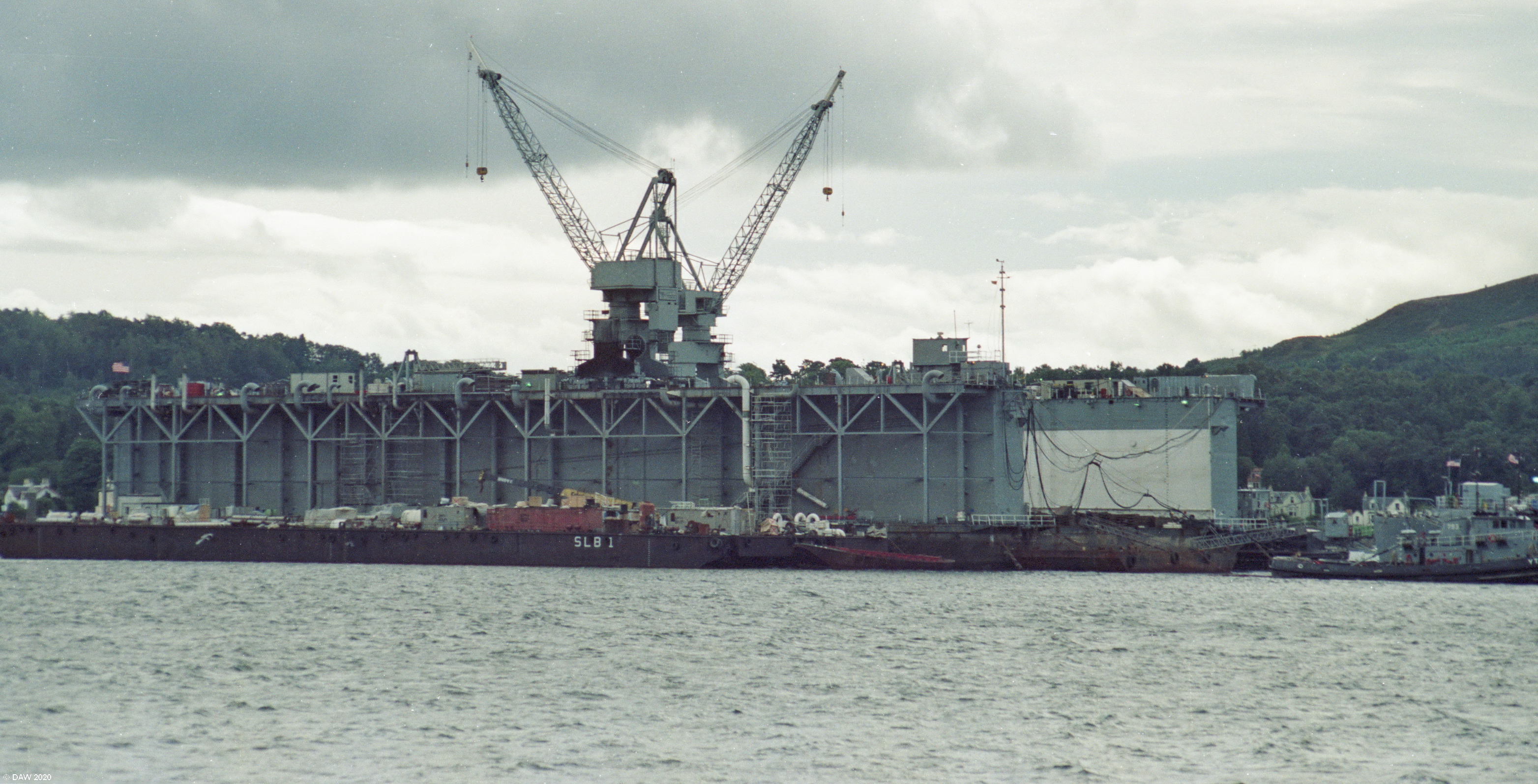 Pictured in the late 1980's in Holy Loch, the floating dock was part of the permanent presence the US Navy had there from 1964 until 1992 in support of the US Polaris Missile Submarines. The dock was built in 1944 and consisted of 7 seperate modules. In 1961 4 sections were brought to Scotland. The dock was capable of lifting a Polaris Submarine completely out the water for maintenance.