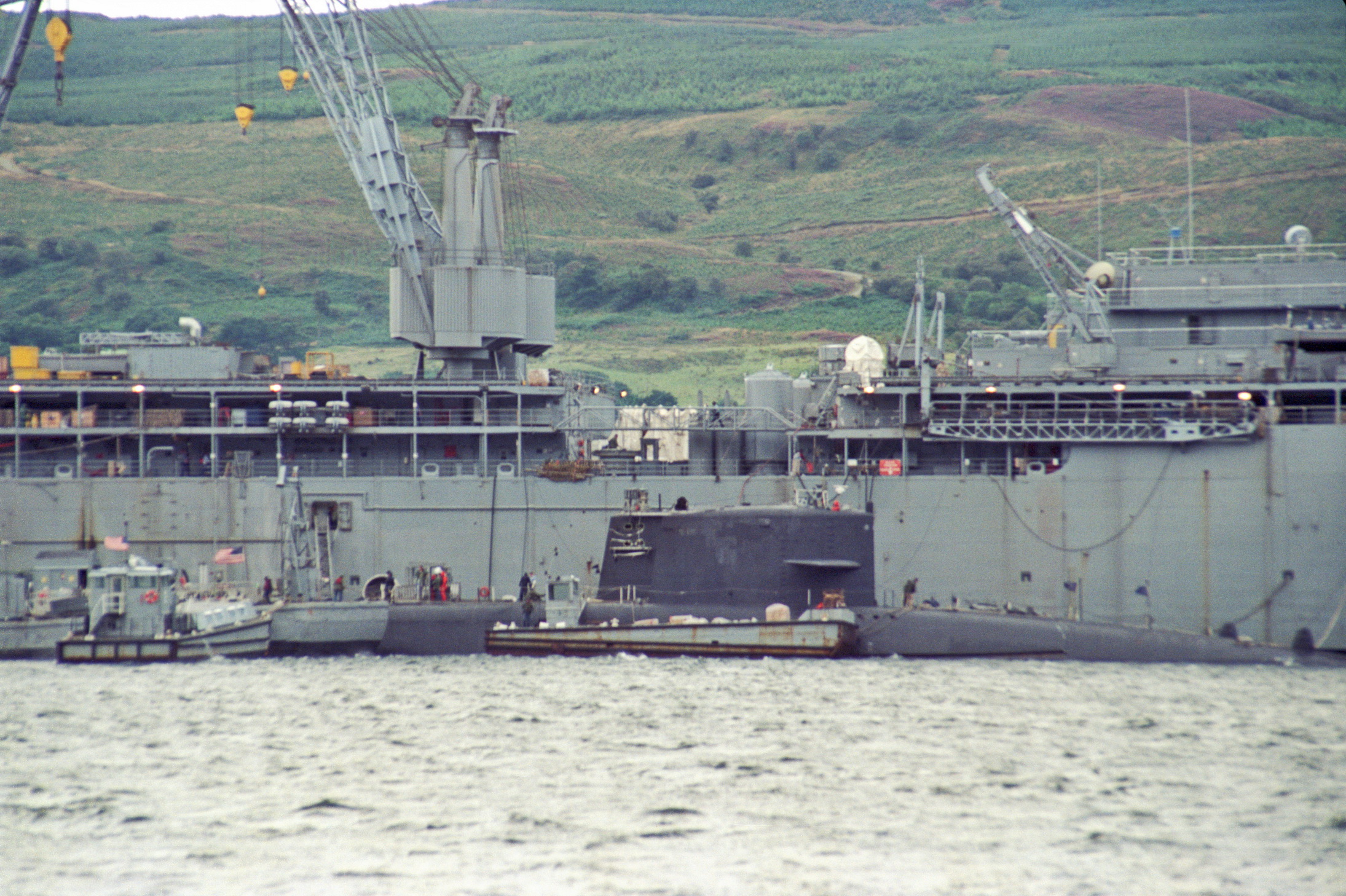 A US Navy Submarine lies alongside the Submarine tender ship USS Simon Lake on the Holy Loch some time in the late 1980's. The US Navy had a presence here from 1961 until 1992 to support its Ballistic Missile Submarine fleet.