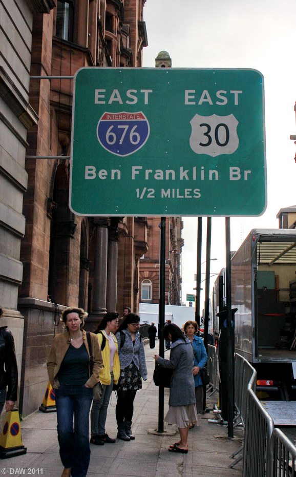 Don't follow this sign, its much further than half a mile. The Benjamin Frankilin Bridge is Philadelphia's equivalent to the Kingston Bridge, but longer.
