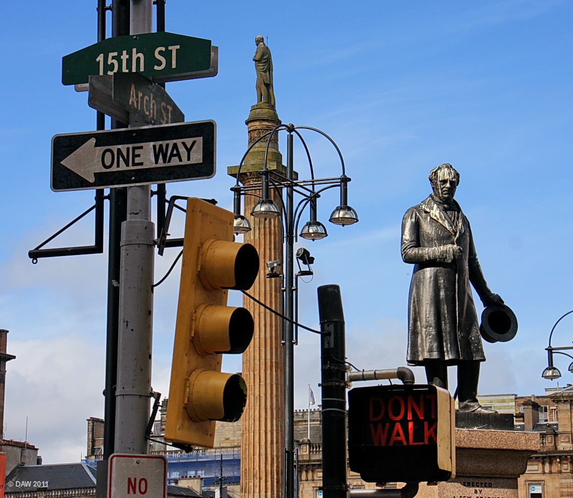 James Oswald appears to be looking down at events in George Square with a bemused expression.
