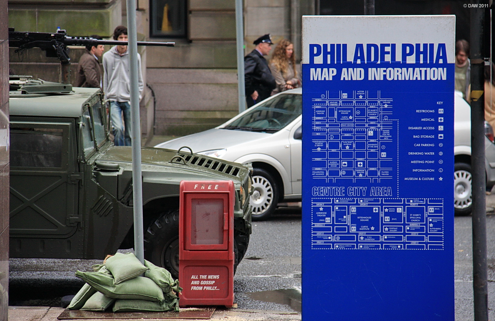 Probably the first time since 1919 that there has been armed vehicles in George Square. On that occassion it was after riots over a dispute about shorter working hours backed by widespread strikes. There was real fear in London of a Bolshevist uprising in Glasgow. Only Zombies to worry about this time though.