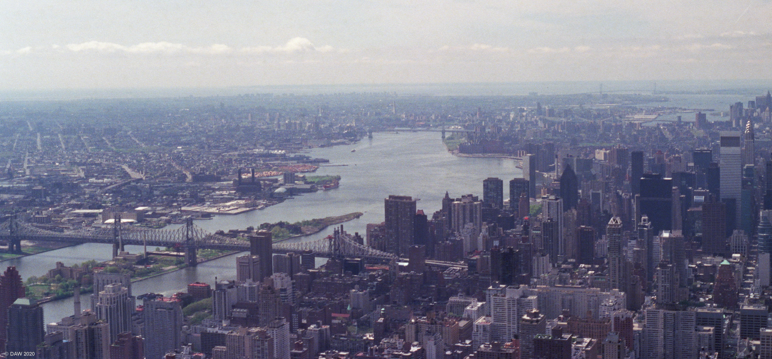 A view looking down the East River, the Island in the middle is Roosvelt Island with the Ed Koch Queensbroro Bridge crossing it.