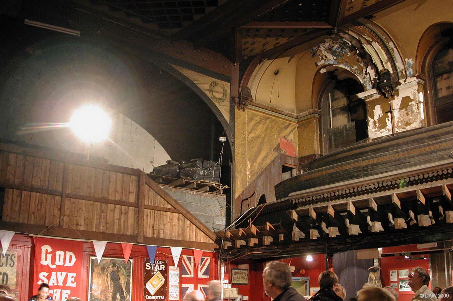 |This view is looking towards where the stage would have been but building work since it closed has partly blocked it off. The music hall closed in 1938 since by then many cinemas had opened up around Glasgow. It was 'rediscovered' in the late 1990's having been used as a storage space since it closed in 1938. The catagory A listed building is now in the hands of a trust