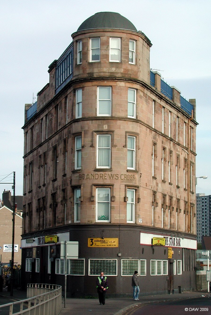 The distinctive triangular shape of the St Andrews Cross building at Eglinton Toll on the south side of Glasgow, probably dating from around 1888. Note the frosted glass windows of the Star Bar on the ground floor, this used to be a tradition so that good people wouldn't be corrupted by seeing all those people drinking inside. Map location.