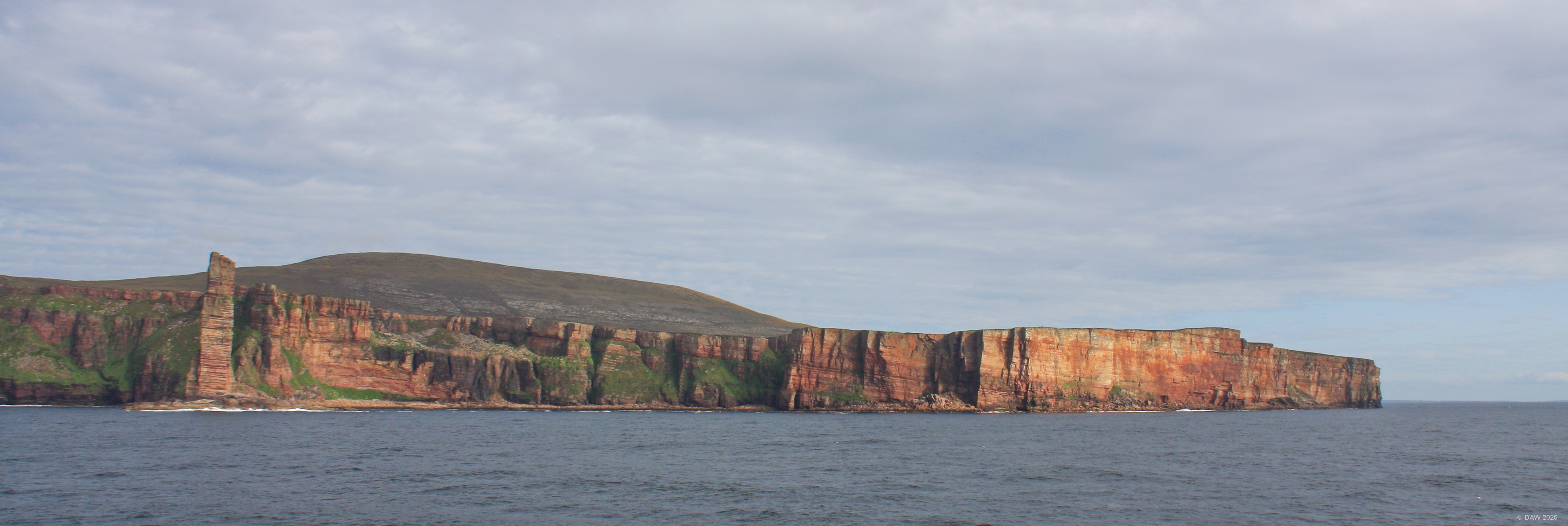 A view of Hoy from the ferry between Scrabster and Stromness. The Old Man of Hoy sea stack can be seen on the left.