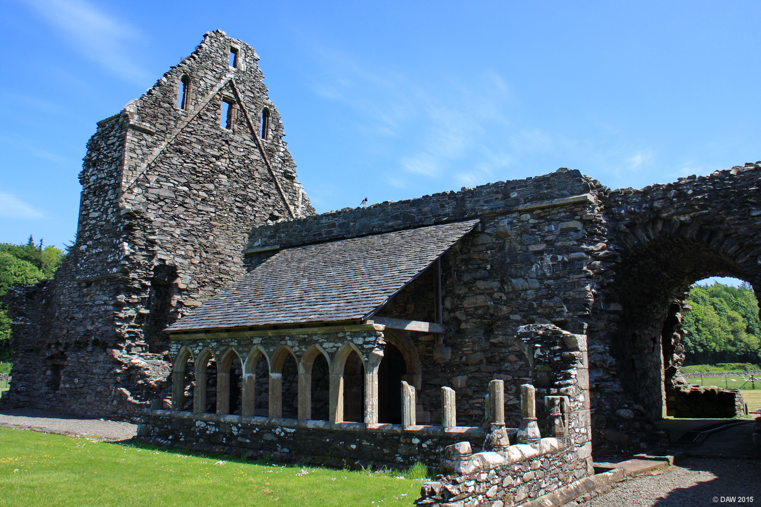 Reconstructed cloisters at the ruins of Glenluce Abbey. The gable end is all that remains of the church of the former Cistercian Abbey.