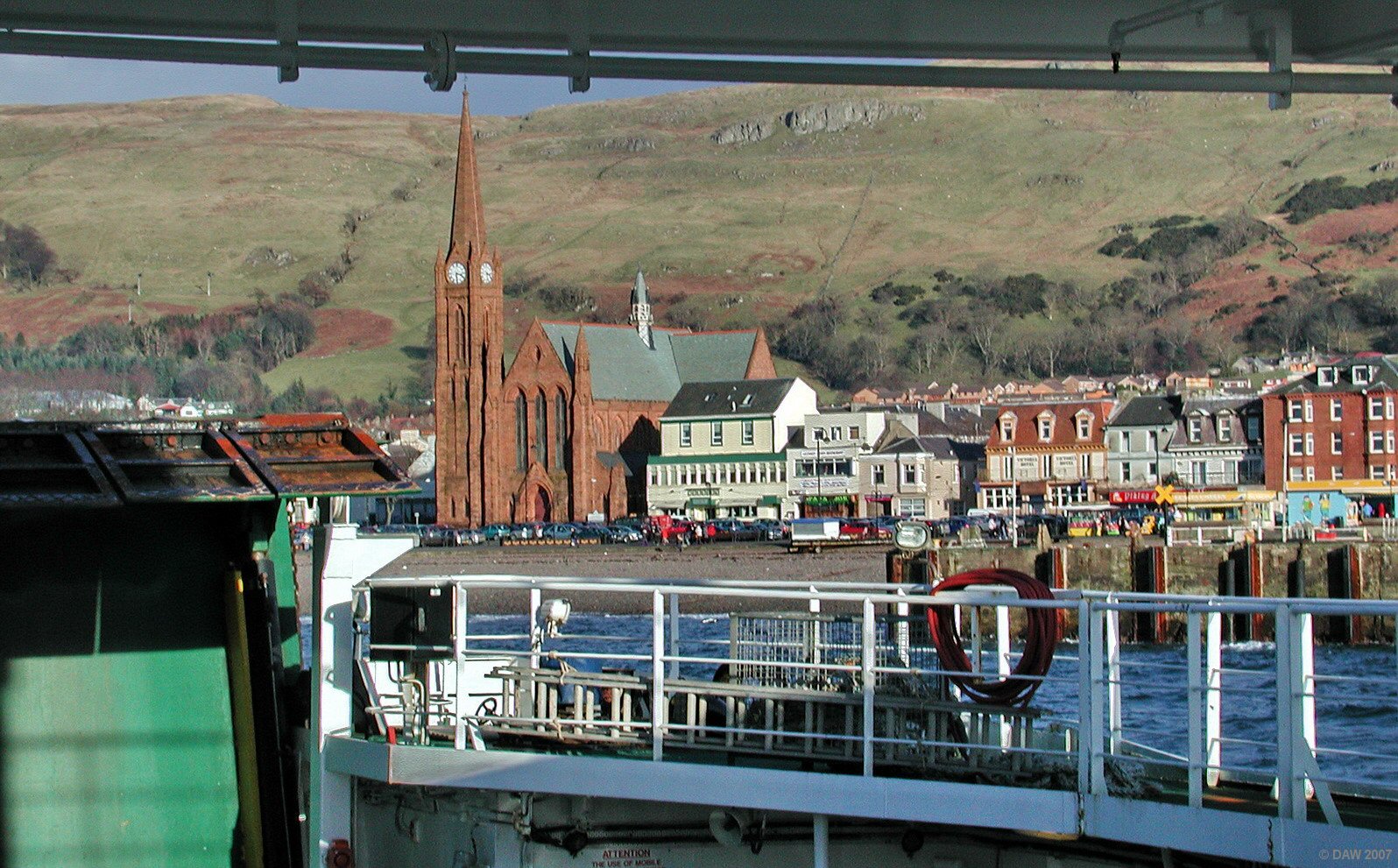 The view the intrepid traveller sees on returning from an overseas trip to the Great Cumbrae, an epic crossing of some 15 minutes, apparently the most expensive car ferry in Scotland. The winter sun highlights the red sandstone of St Columba's Church, the old stone pier is on the right. Map location