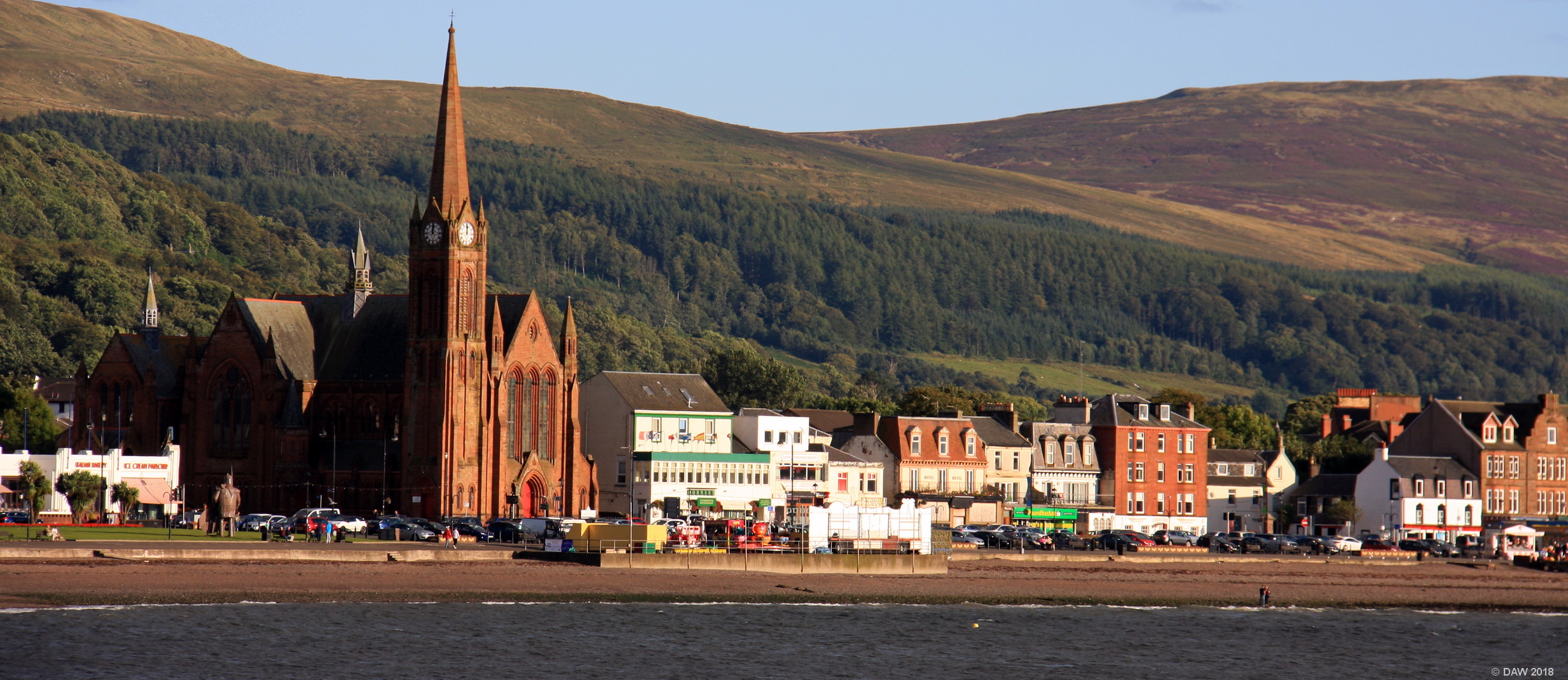 The evening sun on the seafront at Largs. Taken in 2014 from Aubery Park.