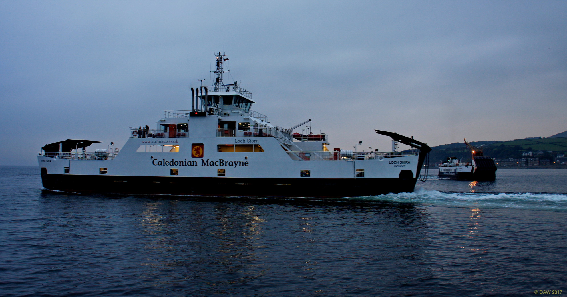 Maybe more dusk than night. Loch Riddon approaches Largs Pier while Loch Shira leaves.