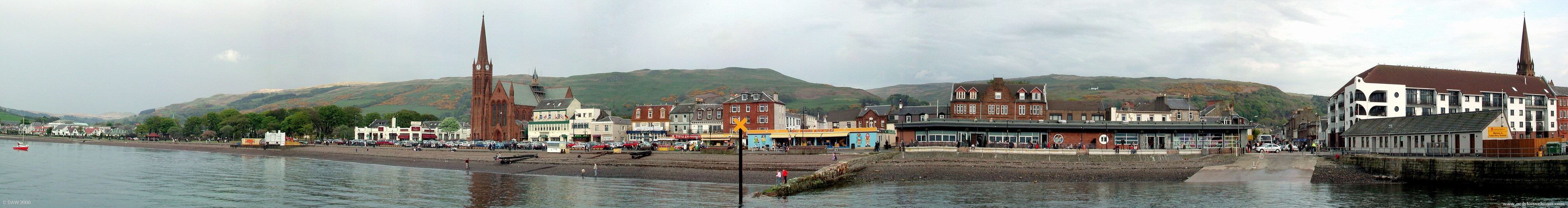 The two spires are from the Clarke Memorial on the right and St. Columba's on the left. The flats on the right hand side are where "The Moorings" used to stand. Like Nardini's, it was owned by an Italian family. Being such a landmark, when it was demolished it was decided to replace it with a building of similar style, hence the prominant bow shaped corner. Nardini's can be seen to the left of St Columba's Church.