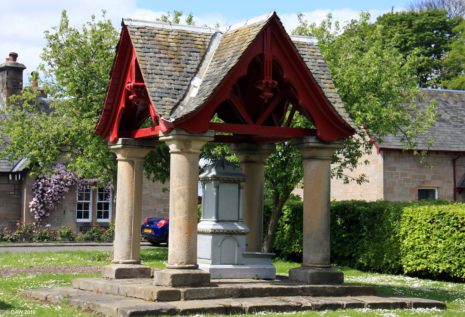 Dunmore is a very small planned village built by Catherine Herbert, widow of the 6th Earl of Dunmore to improving the housing for the estate workers. It has the appearance of an English style village green surrounded by the cottages. The cottages, a school and the well pictured here were all completed by 1879. Map location.