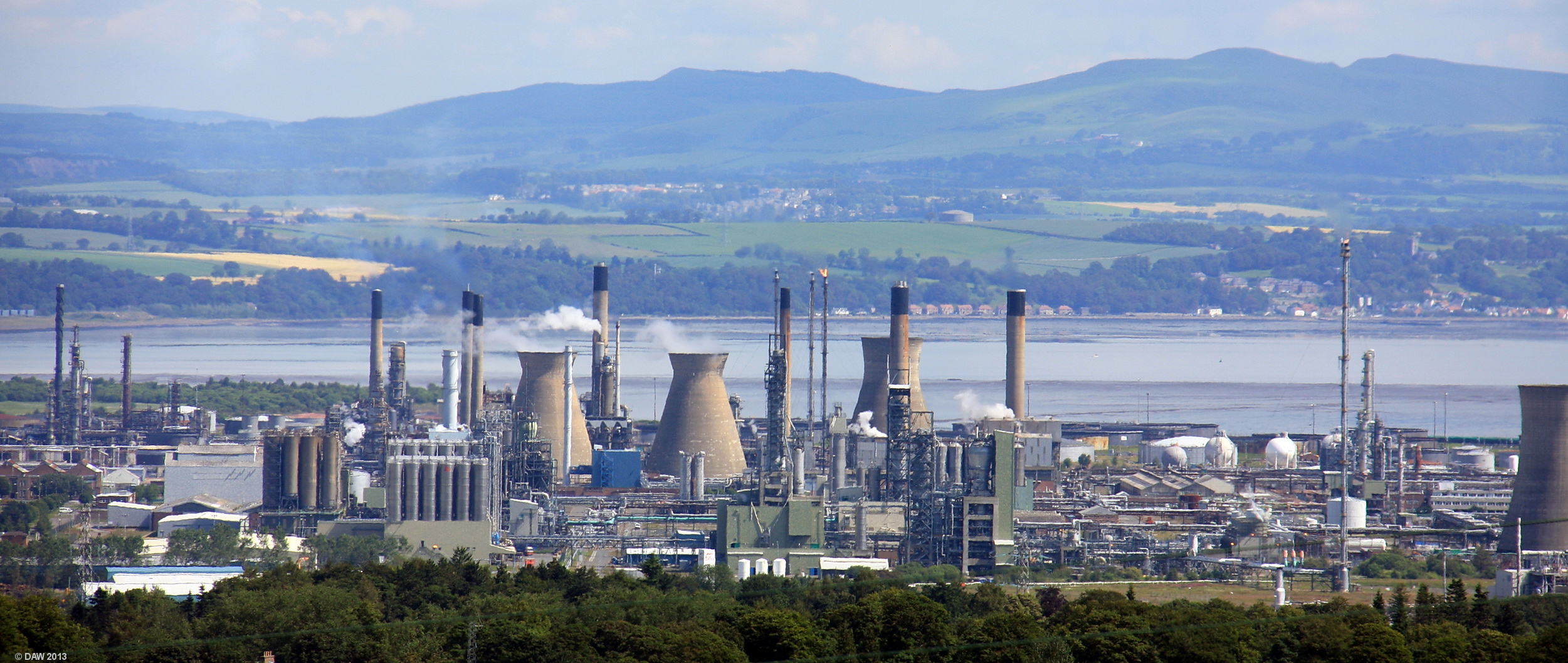Grangemouth is Scotland's only refinery, supplying products to Scotland, the north of England and Northern Ireland. It started in 1924 as Scottish Oils and is now operated by Ineos. There is a pipeline between here and Finnart Oil Terminal on the west coast allowing deep water access for crude tankers and also for finished product. Map location.