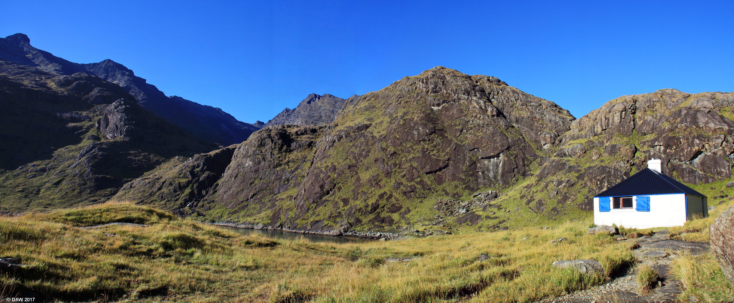 Built in 1959 in memory of two young climbers who lost their lives on Ben Nevis in 1953. After completion it was handed over to the Junior Mountaineering Club of Scotland who maintain it to this day. The only way to get here is a long walk or a boat trip over from Elgol. Map location.