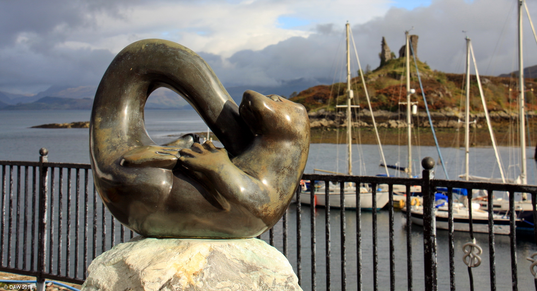 The significance of the Otter here is that the Author of "Ring of Bright Water", Gavin Maxwell, lived not far from here in the lighthouse keepers cottage on Eilean Ban. The 15th century Castle Moil is in the background. Since this photo was taken in 2014 a lightening strike brought down part of the structure on the left. Map location.