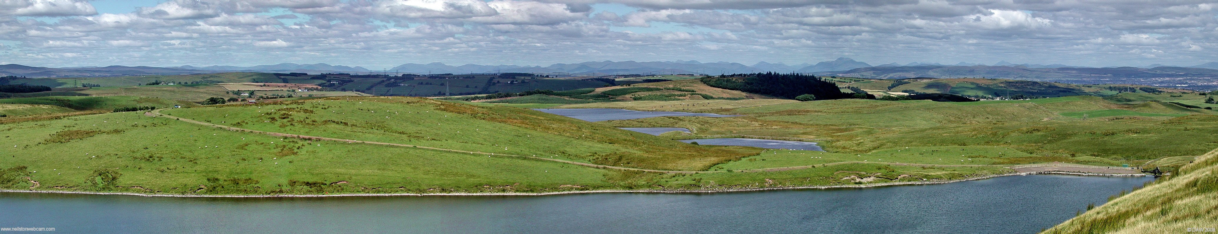 At only 282m James's Hill gives a surprisingly good view over East Renfrewshire and beyond. In the foreground is Long Loch and behind that Harelaw Dam. On the left Glasgow can be seen in the distance. The Neilston Pad is where the dark patch of trees are and to the right of that can be seen the familiar 'shoulder' outline of Ben Lomond. Map location.