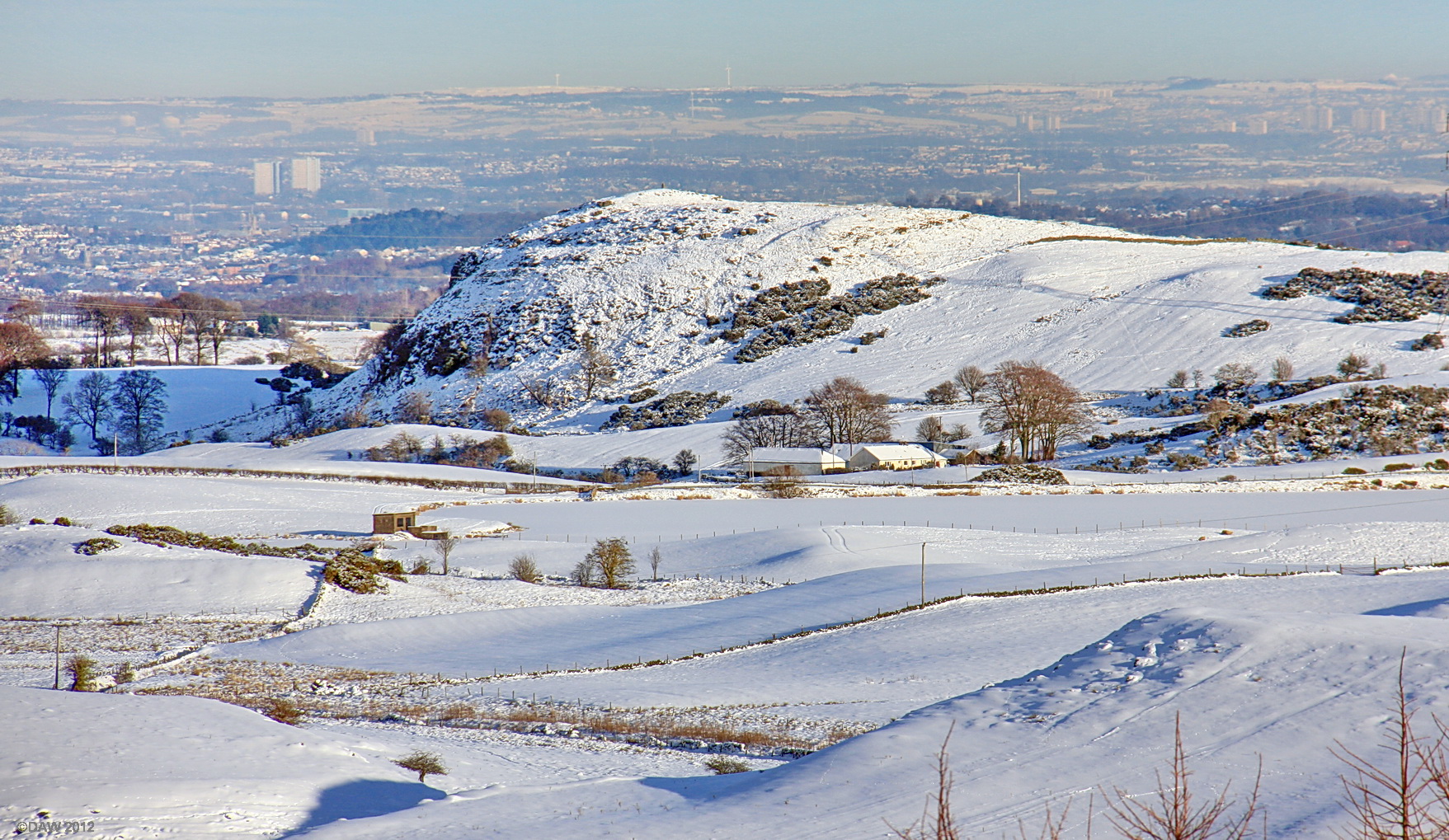 Locally known as 'The Craigie' seen from the Neilston Pad. A snow covered Walton Dam is on the right. With a bit of imagination (actually quite a lot) you can just about see the line of the enclosure around the top of the hill that once made this an Iron Age fort. Map location.
