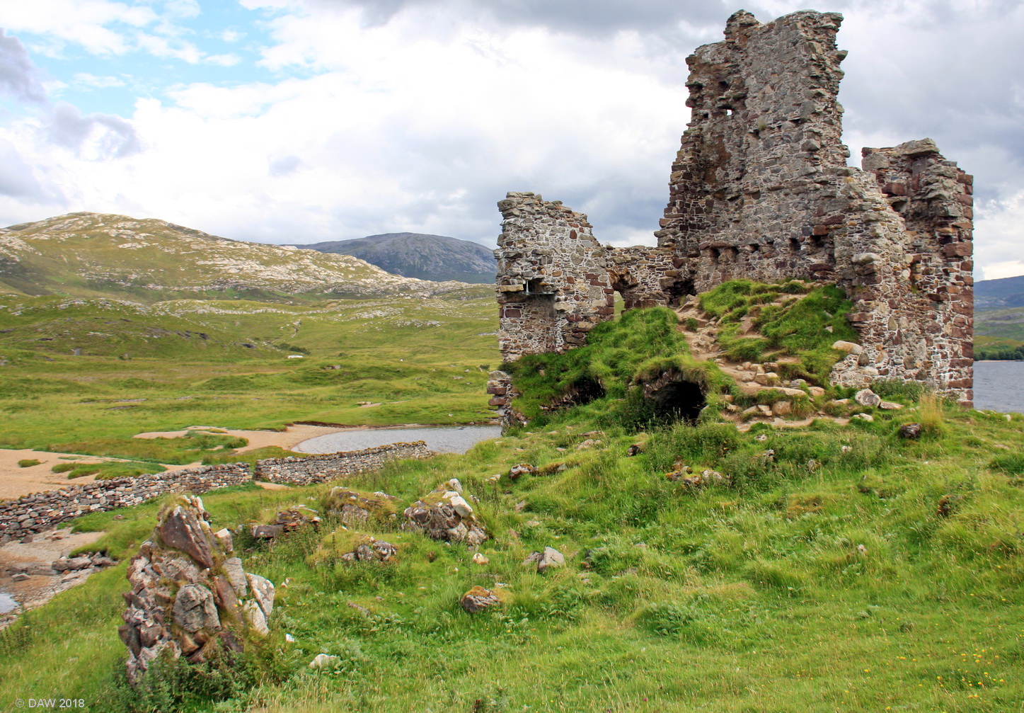 This view of Ardvreck shows just how little of it is left. Built around 1590 by the Clan Maclead who owned much of the Assynt area of Sutherland. Clan Mackenzie attacked the castle in 1672 and took control of the MacLeod lands. The MacKenzies built a large house nearby in 1726 but it burnt down only 10 years later in mysterious circumstances, perhaps a Macleod with a grudge! Map location.