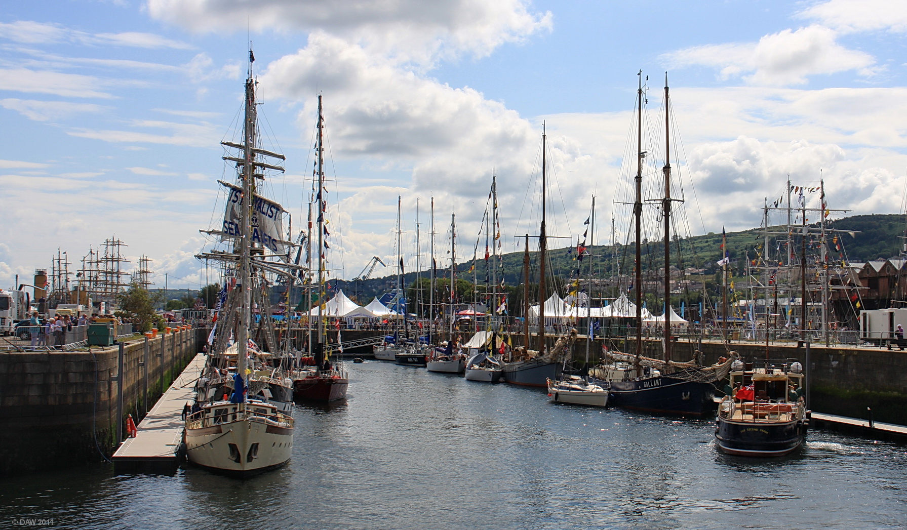 Taken during the tall ships event at Greenock in 2011. The dockland is in the process of being reborn as a marina. All these masts into the distance give an idea of what the busy port of Greenock might have looked like 150 years ago when large sail ships would have been a common sight. Map location.