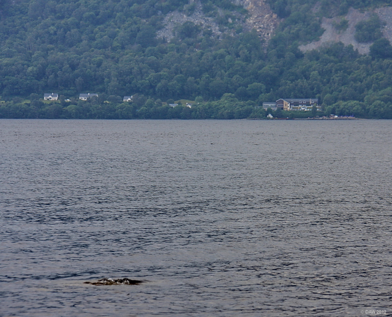 Conclusive proof at last, as if it was ever needed. The head had just gone below the surface as I swung my camera round to see her slip away into the murky depths. I'm sure she winked. Looking over towards Drumnadrochit from the eastern shores of Loch Ness. Map location.