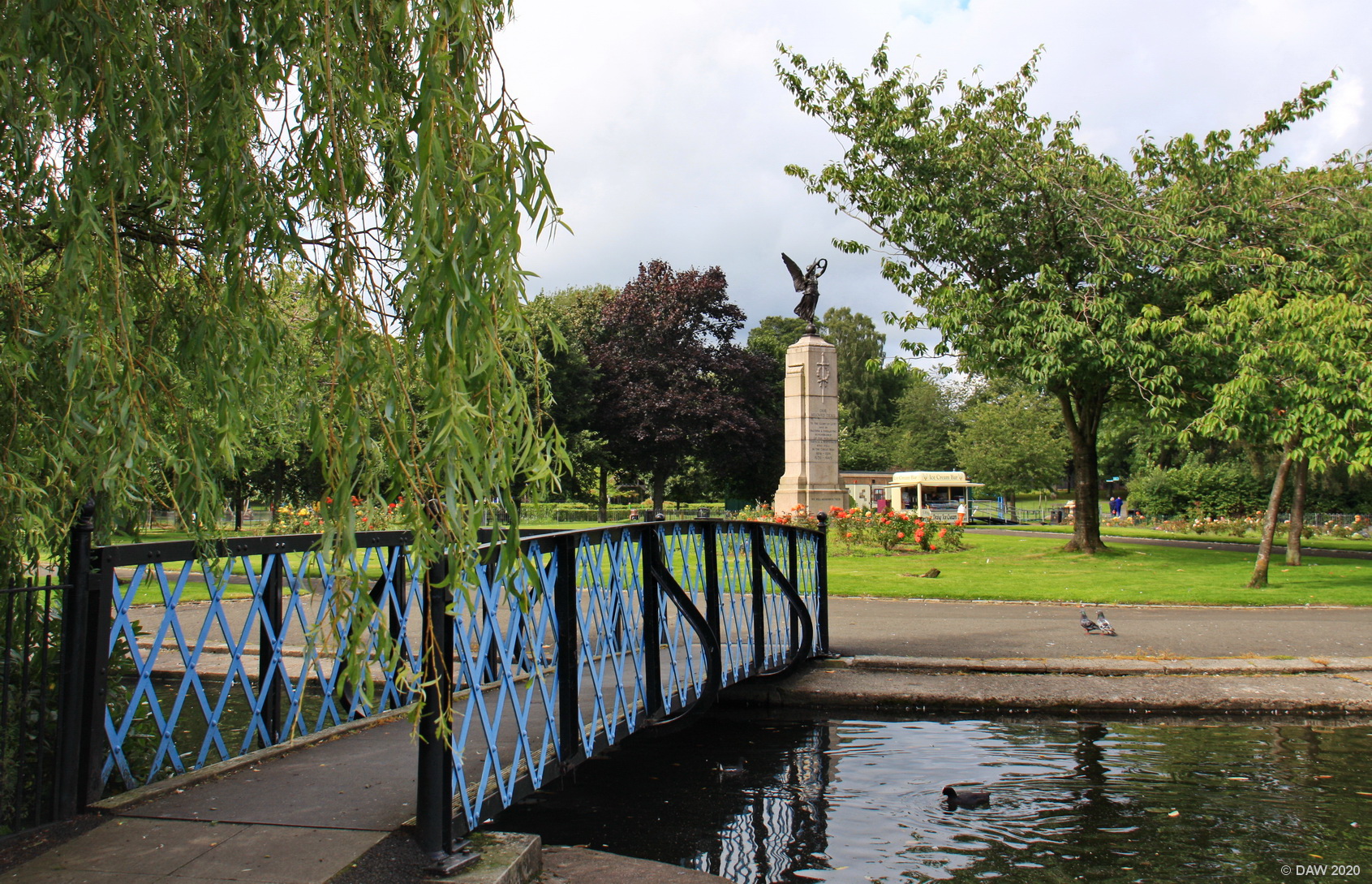 The War Memorial and pond at Glasgow's Victoria Park.