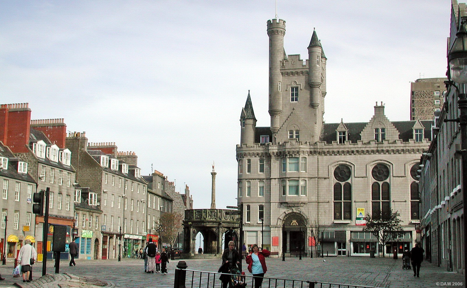 The Mercat Cross, in the centre of the picture, was built in 1686 and was typically the site of public punishments and royal proclamations. The impressive building with the tower is the Salvation Army Citadel, opened in 1896.