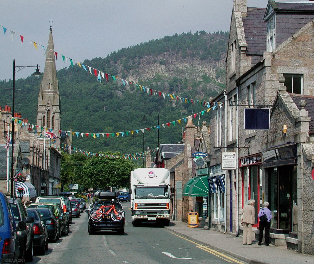 The busy streets Ballater. The town dates from the 19th when it was a popular destination for those visiting the nearby Pannanich Wells Spa. Ballater station was where the Royal family would arrive when visiting nearby Balmoral Castle. The Railway line was closed many years ago and the station is now a visitor centre. Map location