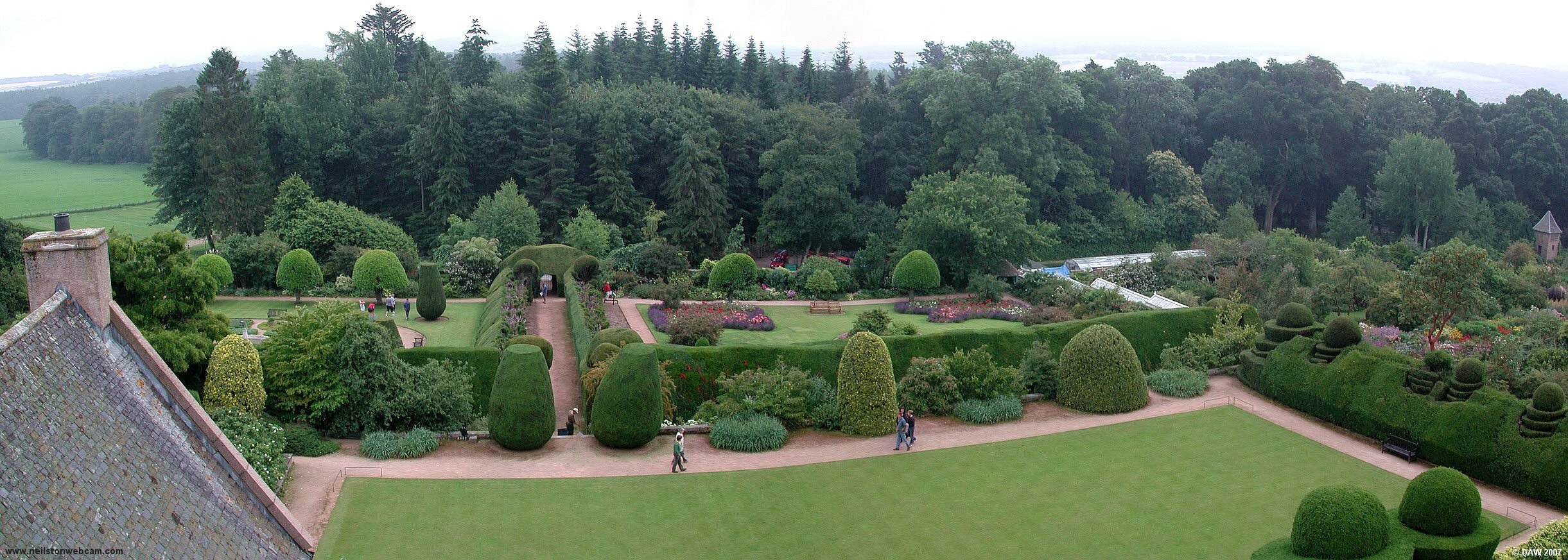 Looking out from the top floor of the Castle you get a view over the gardens at Crathes. It is famous for its yew hedges and sculptured topiary, some of the hedges were planted as early as 1702. The walled garden is off to the right.