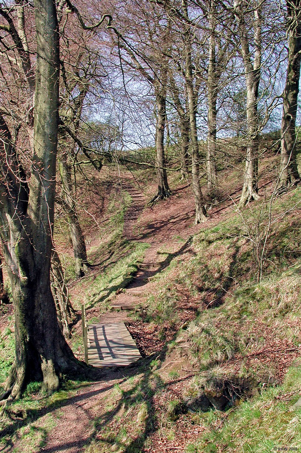 Early spring sun shines on the footpath that climbs up Killoch Glen.