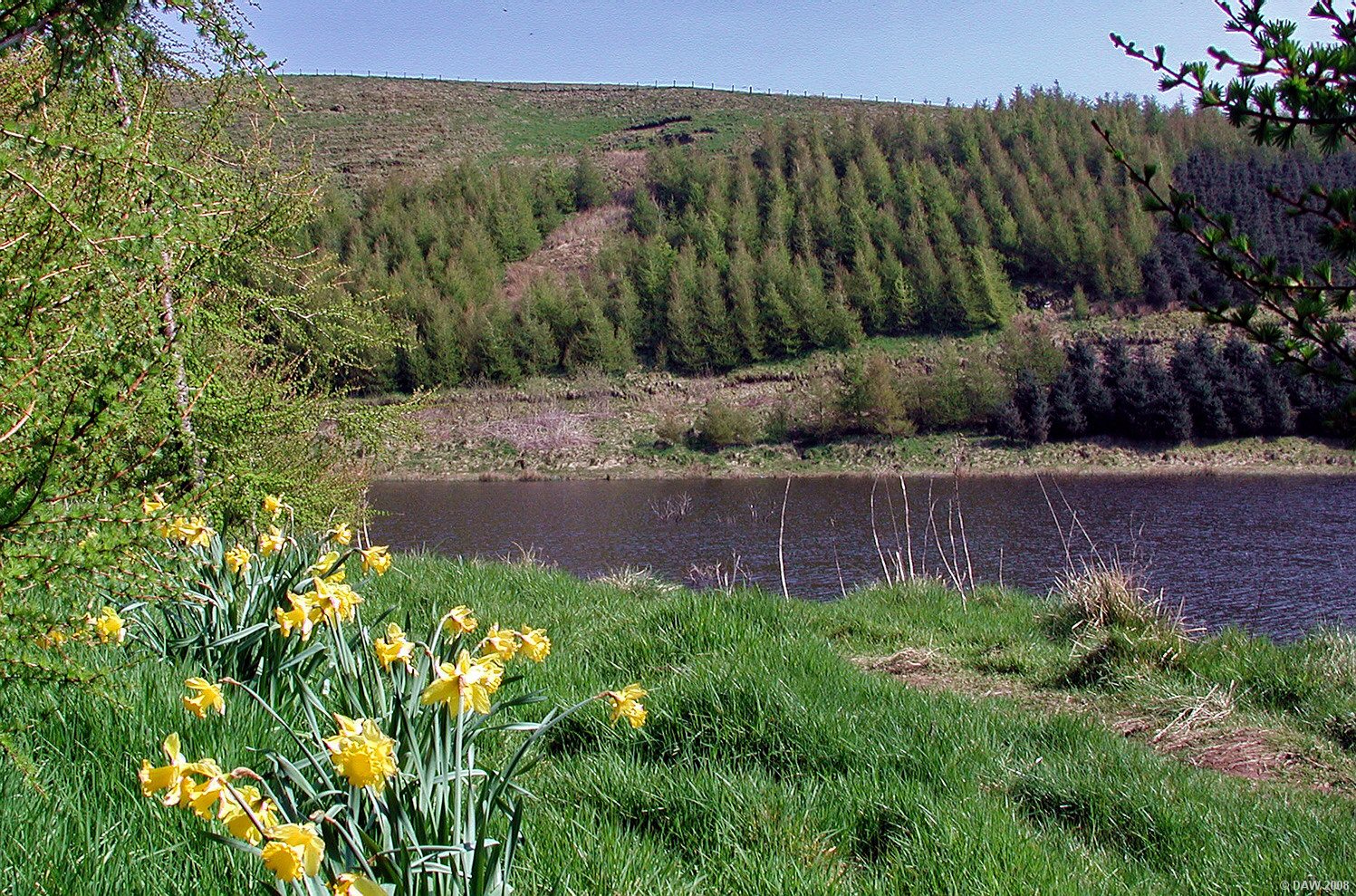 How these daffodils got there are a mystery but they do add to the fresh green of spring in this view of Craighall Dam with the tail end of the Neilston Pad behind.