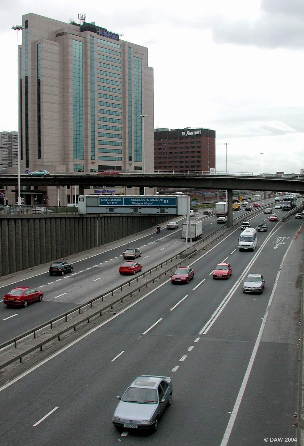 During the 1960's large areas of Glasgow were laid aside for redevelopment, the city planners realsied that as a result it would be possible to drive a motorway almost through the centre of the city and over the Clyde. In 1970 the Kingston Bridge was opened completing the Glasgow part of the Motorway.