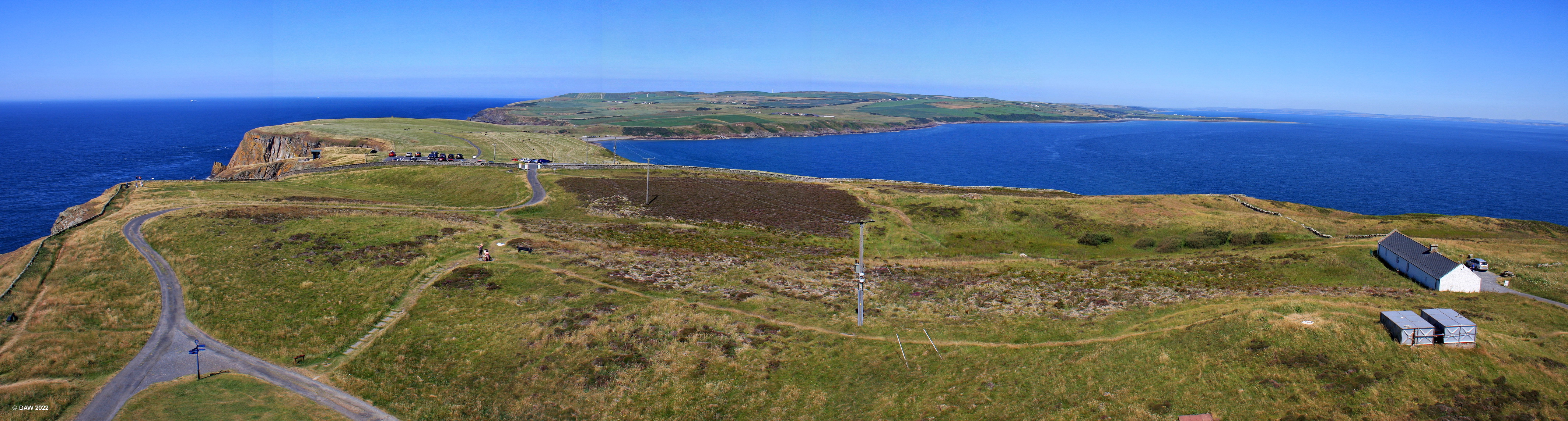 A panoramic view looking North West from the top of the Mull of Galloway Lighthouse. The building on the right is the visitor centre for the RSPB reserve. On the left near where the cars are parked is the Mull of Galloway Visitor centre perched on top of the cliff. Map location.