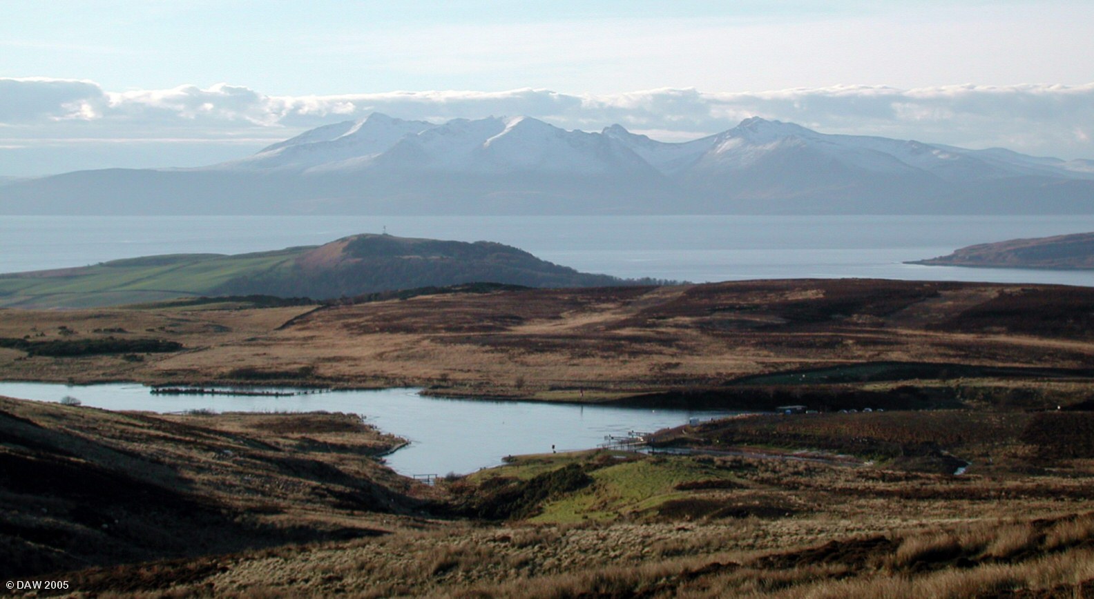 This winter view of Arran is taken from the Fairlie Moor road over looking the Fairlie Moor Trout Fishery on Glenurn Reservoir. Behind that is Goldenberry Hill at Hunterston. On the right of the photo Gull Point on the Little Cumbrae island can be seen.