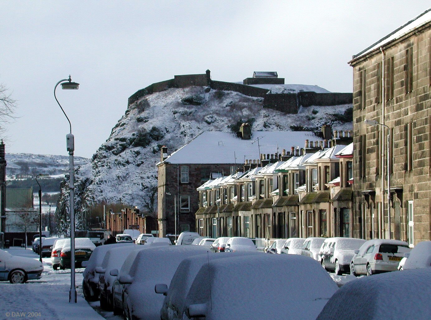 Dumbarton Castle viewed from the streets of the town of Dumbarton