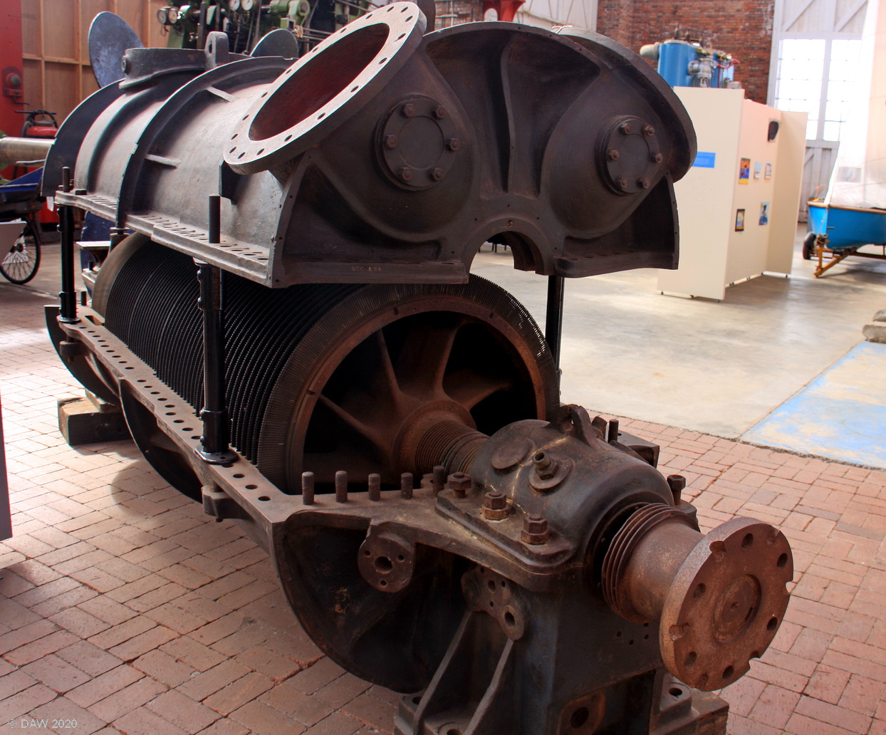 An example of an early marine steam turbine with its casing opened up at the Maritime Museum in Irvine.