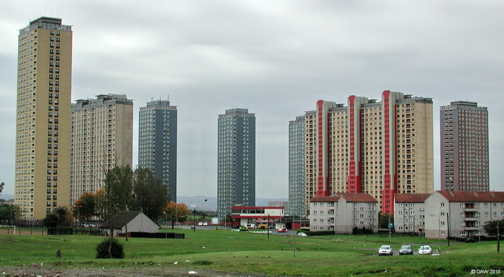 Built between 1964 and 1969 to solve Glasgows housing problems, they consisted of 5 'point' towers and 2 'slab' blocks. The points were 30 floors and the slabs 25, in total they were designed to house 4,700 people. At the time of construction they were the highest blocks in Europe, they were also unusual in that they were the only steel framed residential towers in Glasgow. The last one was demolished in 2015. Map location.