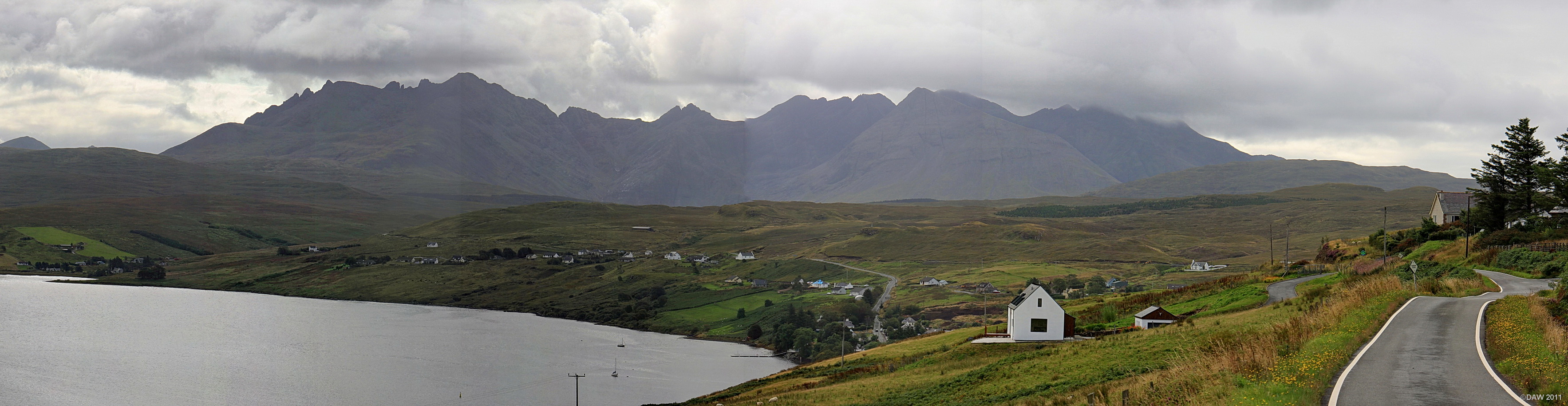 The Cullin mountains dominate the sky line, the highest peak on the range rises to some 986m. The small village of Carbost is low down in the centre of the picture.