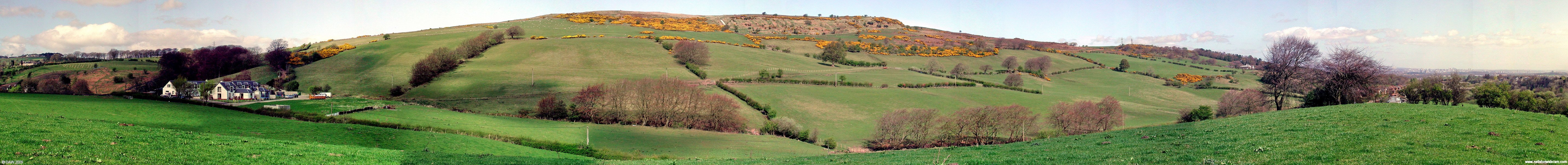 On the extreme left you can just see Auchentiber Farm, then what was Killoch Farm, Killoch hill is the highest hill to the right. The fereneze hills are where the phone masts are with Woodneuk farm below. On the right is the Gateside area of Barrhead with Glasgow in the distance. Map location.