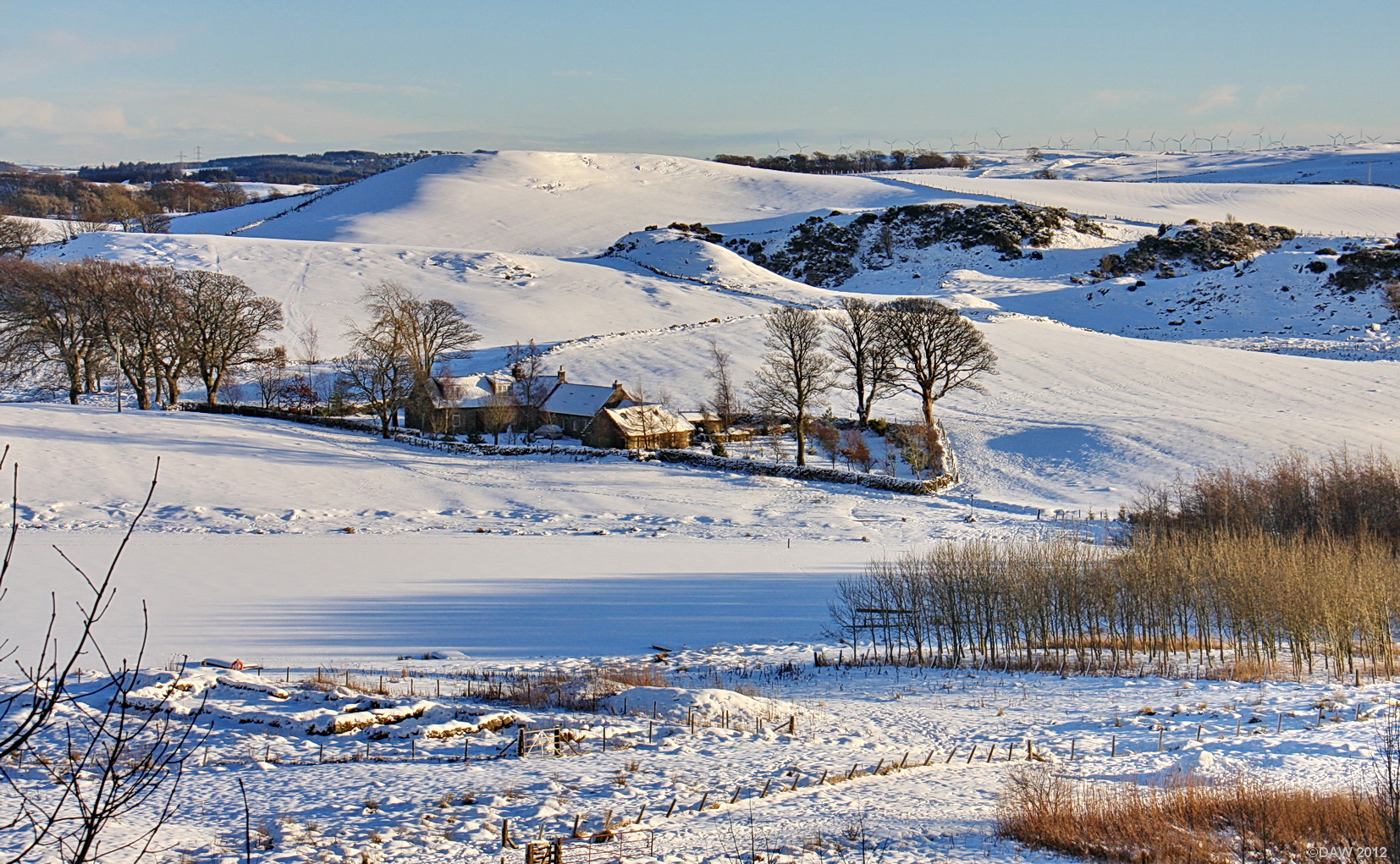 On the lower left you can see the outline of Barrhouse, an early 18th century long house. In the centre is Snypes far, now a private house and towards the top right Whitelee windfarm on the Fenwick Moor can be seen.