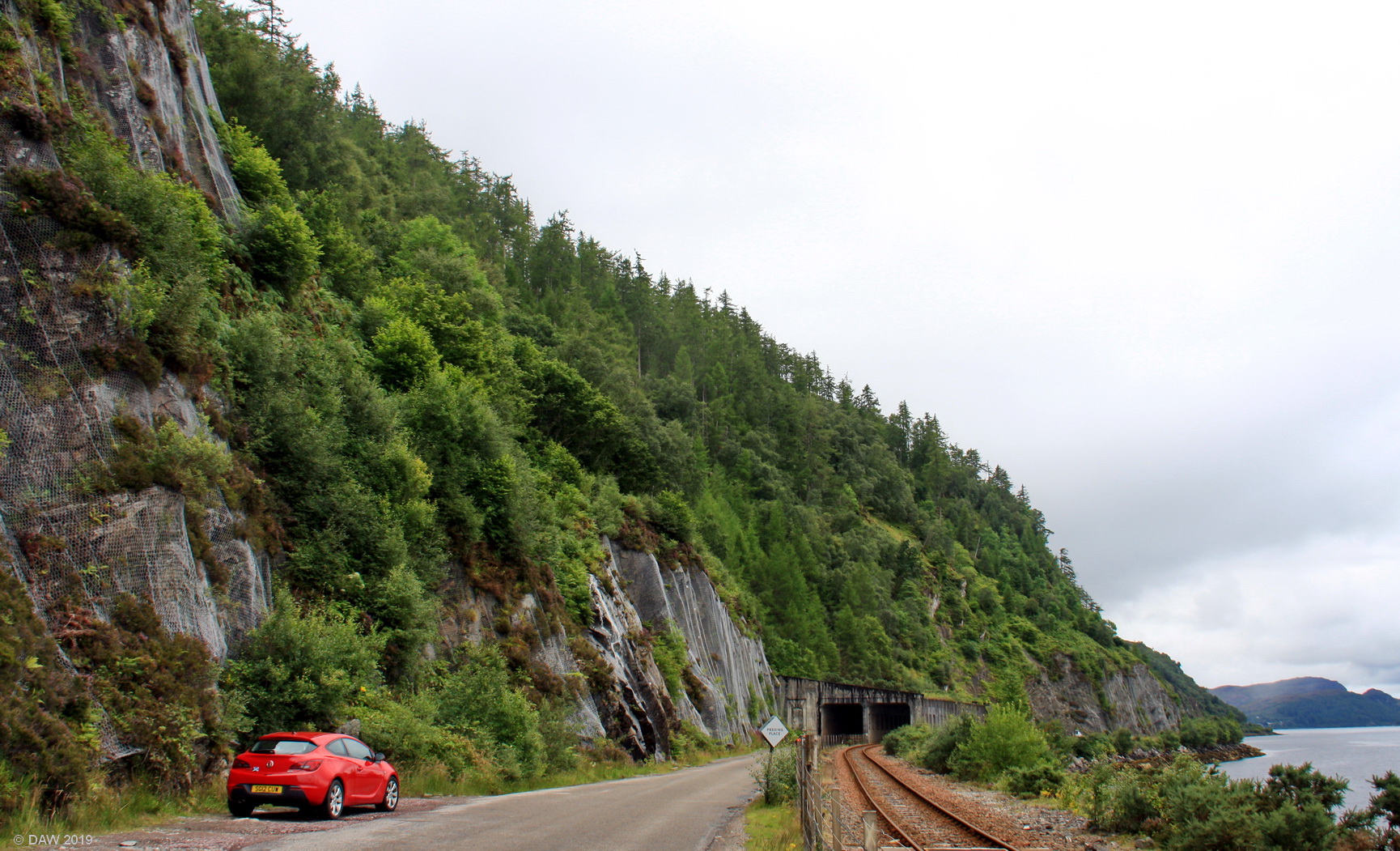 An unusual feature on a road in the UK, I can't think on any other road that has one. Its only about 100m long and covers the single track road and the railway line. This road has been troubled with land slips for many years due to the rock cuttings along the left side at this point. Map location.