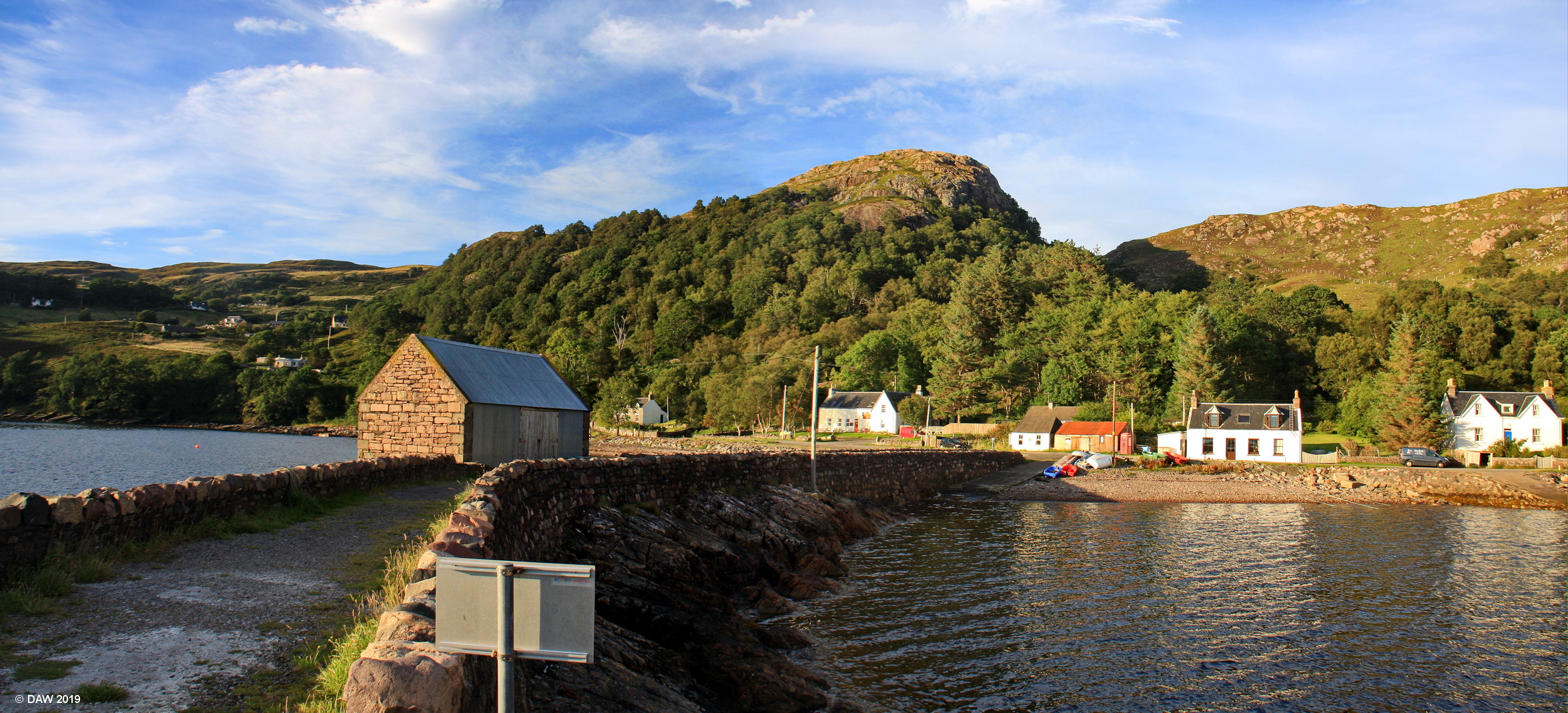 Built on a rocky outcrop know as Sgeir Ghlas (Grey skerries), the evening sun lights up the hills behind.