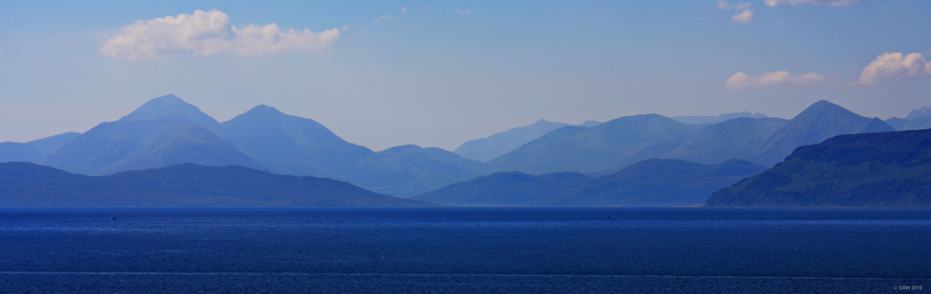 As you approach Applecross from the hills above you get spectacular view of the Islands of Skye and Raasay. On this warm summer day the details of Skye are lost in a blue haze.
