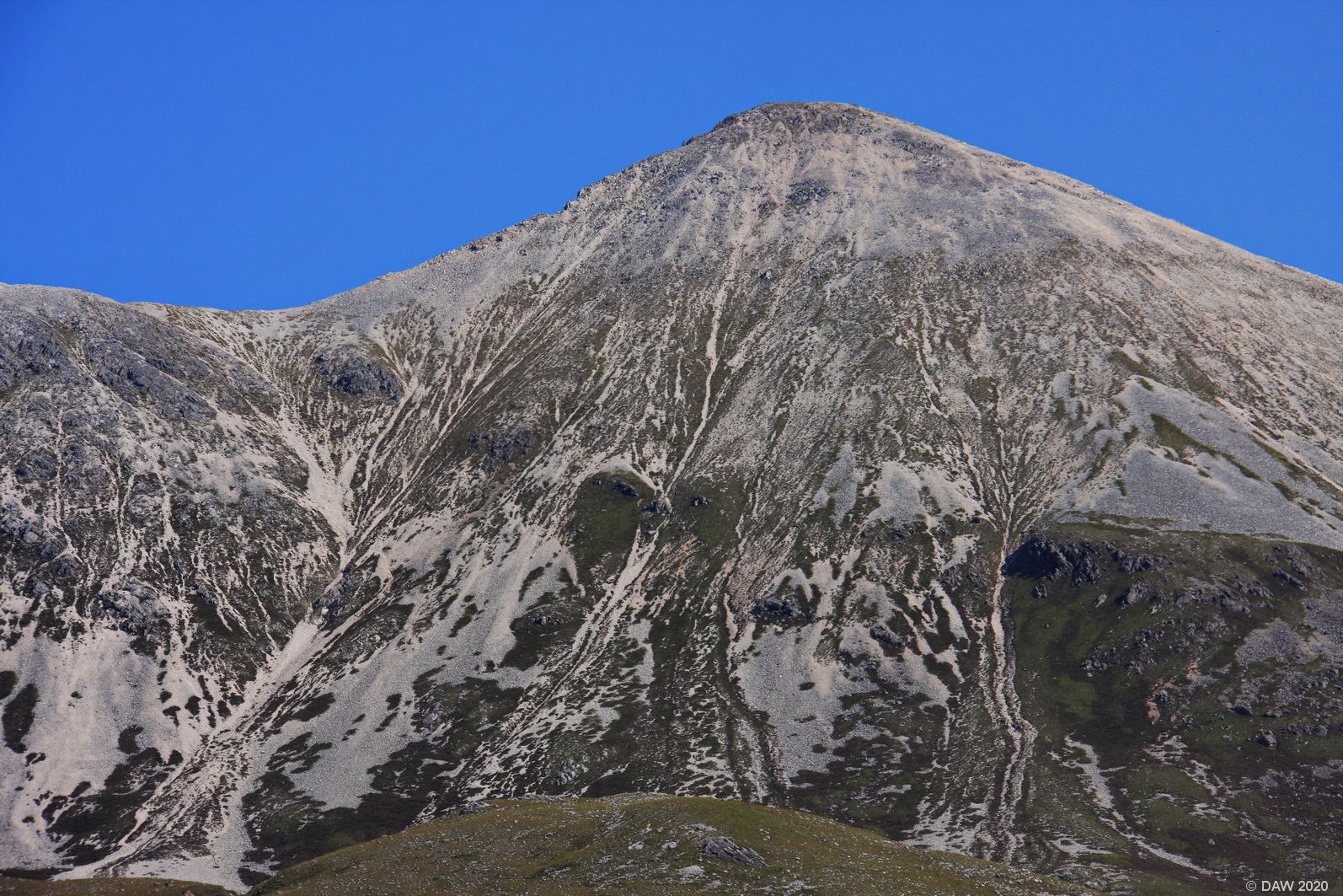 Part of the Torridon mountain range. This peak is particularly striking due to the white coloured rock that comes from quartzite contained in the them.