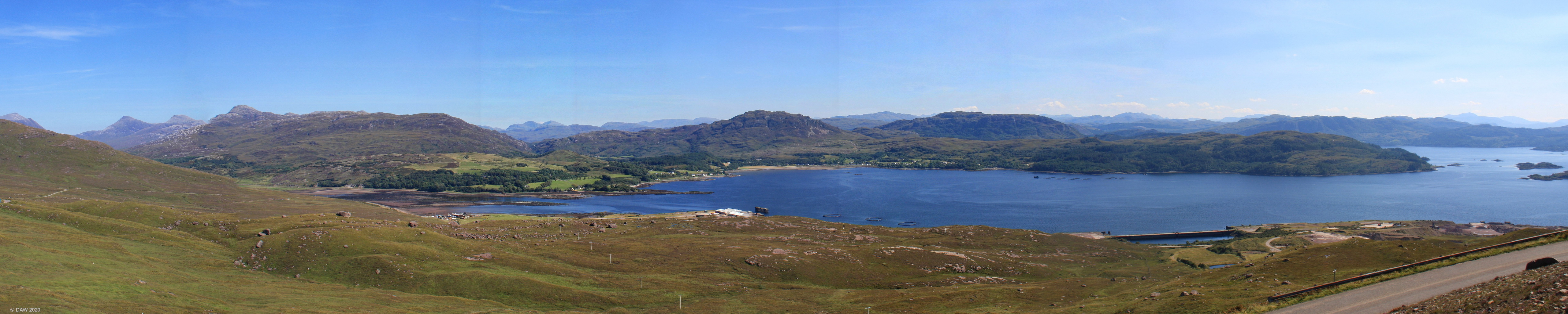 Panoramic view from the Bealach na Ba road looking south over Loch Kishorn. The former Kishorn Oil fabrication yard can be seen on the right. At its peek in the 1980s it employed thousands of workers. Due to its remote location most material came to the yard by boat. Map location.