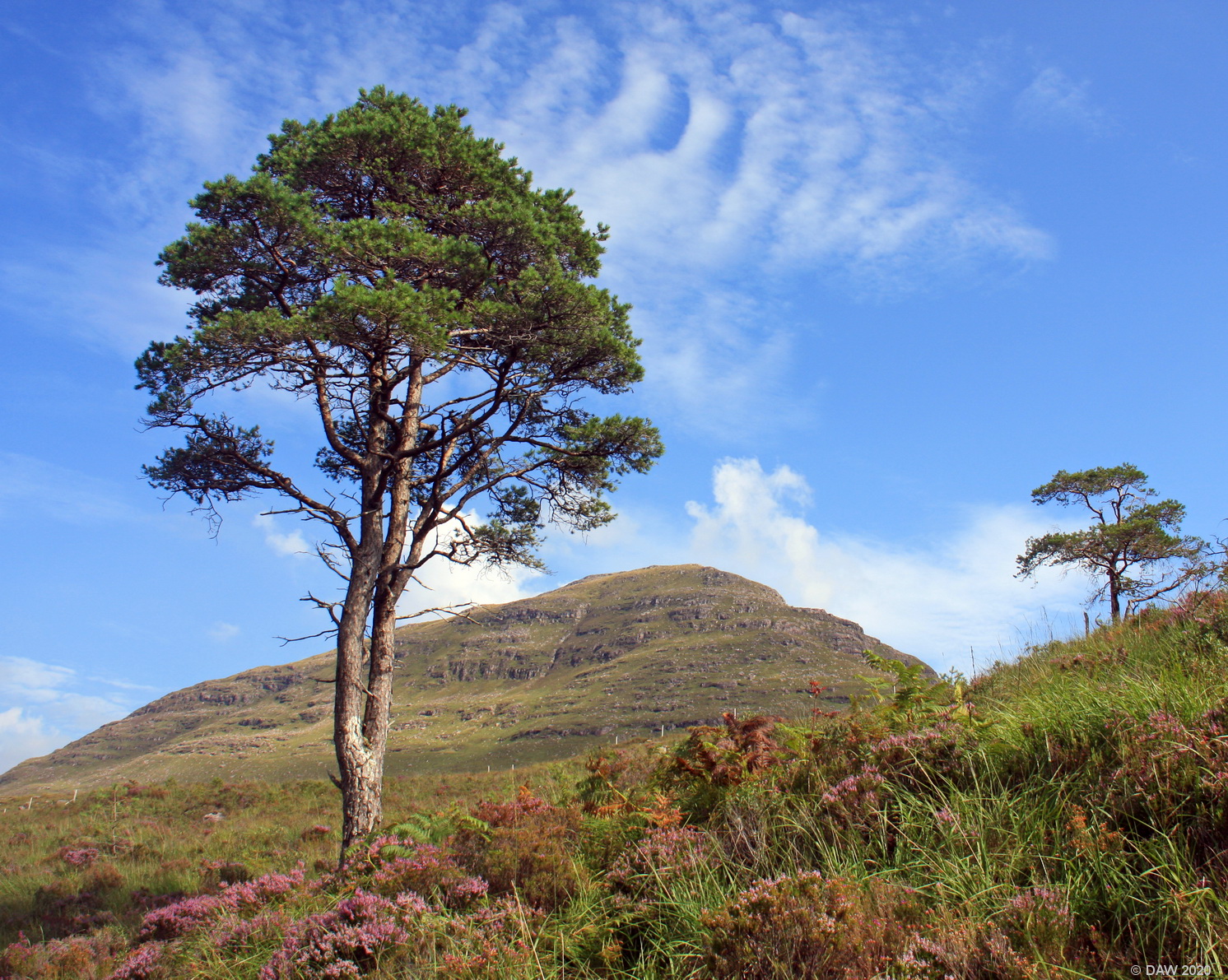 A lonely Scots Pine with Sgorr a Chadail rising to 700m in the background.