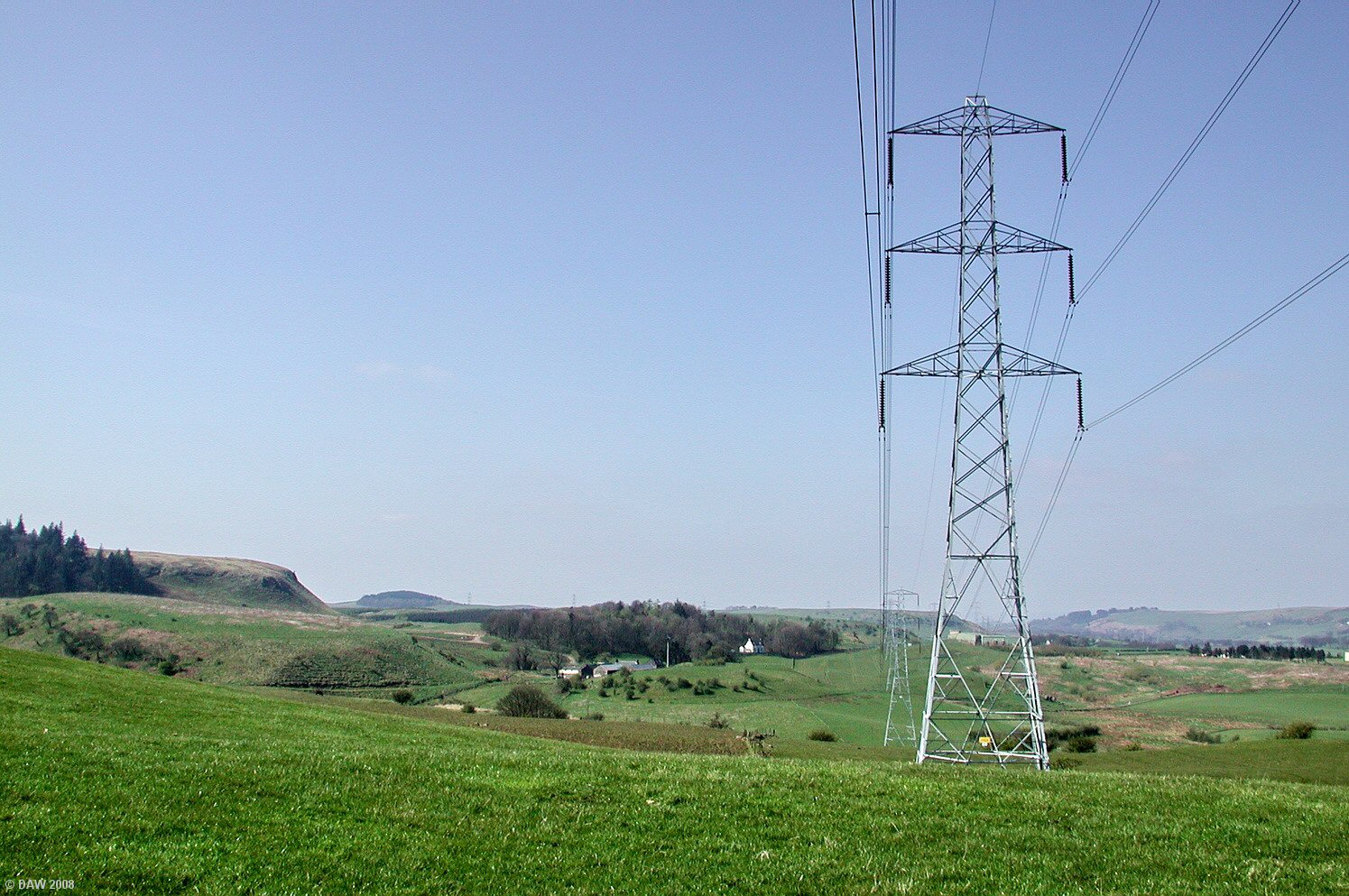 XG68 and friends march purposefully across the rolling hills of East Renfrewshire to the place where Pylons come from, where ever that might be. The Neilston Pad is on the left and Craig of Neilston Farm is in the centre. Map location