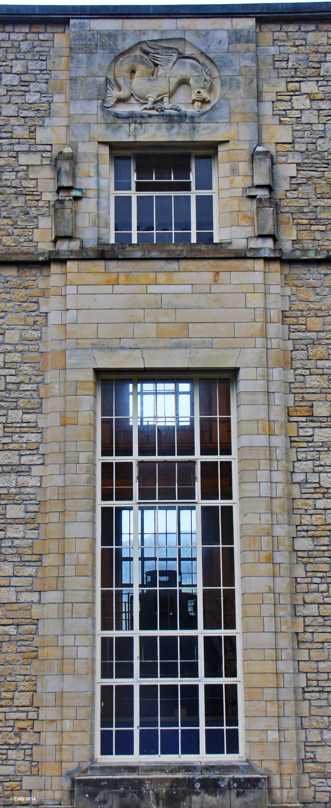 A view through the window of the turbine hall at Frasnakyle, note the fire breathing dragon above the window!  Frasnakyle is the largest power station in the Affric-Beauly Hydro Scheme.  It was commissioned in 1951 and can generate up to 69MW of power.  [url=http://streetmap.co.uk/map.srf?X=231815&Y=829618&A=Y&Z=120/] Map location. [/url]